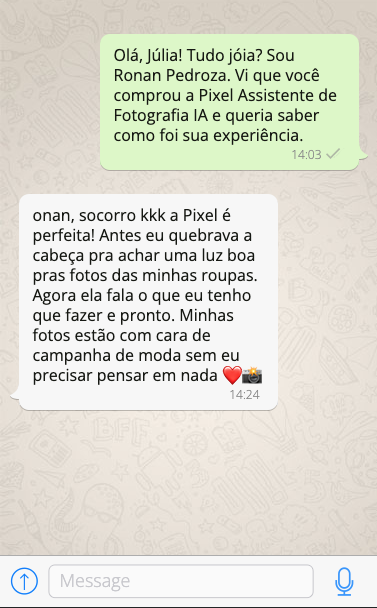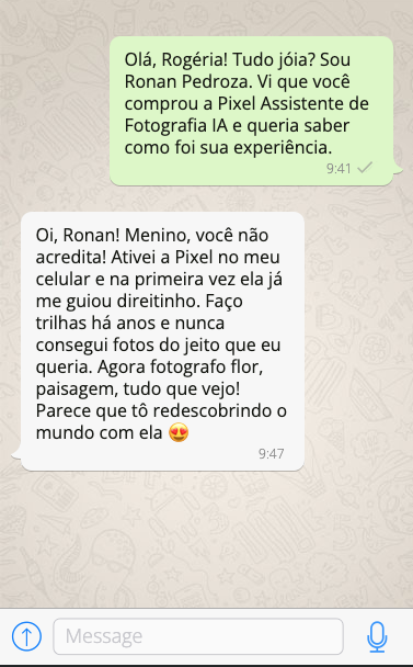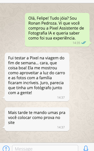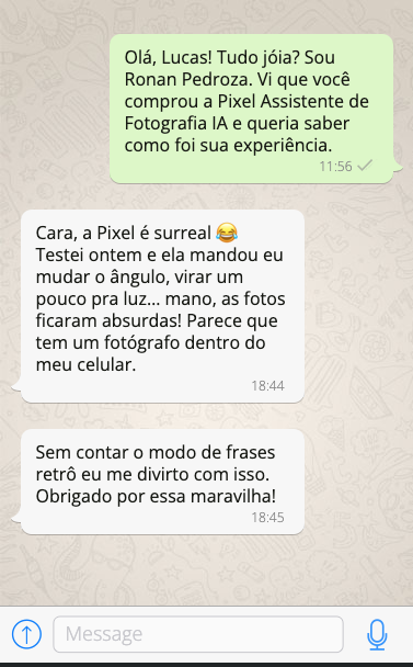 Pixel é um assistente inteligente que te instrui em tempo real, na prática, a fazer fotos incríveis com o celular, sem precisar estudar teoria, assistir horas de vídeo ou decorar técnicas complicadas.